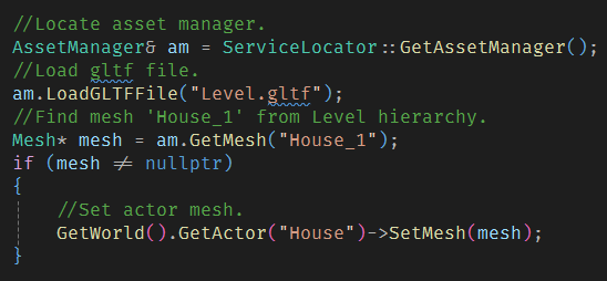 The engine supports the loading of models from GLTF files as well as creating models from raw vertex and index data. The loader is capable of parsing the GLTF files for its hierarchy and storing the meshes seperately. These are stored as a series of Mesh objects which can either be stored by the project or loaded automatically into the Asset Manager.